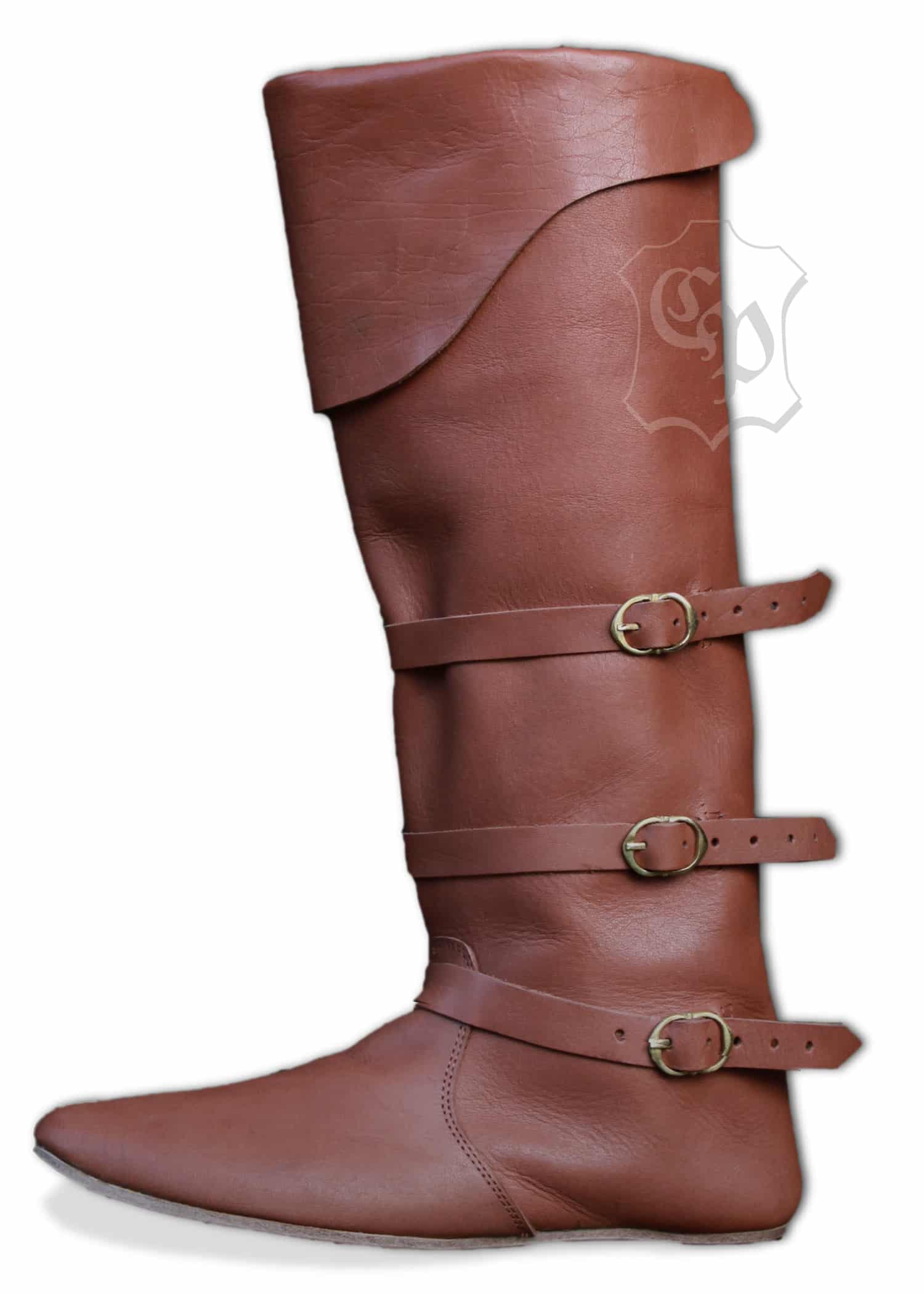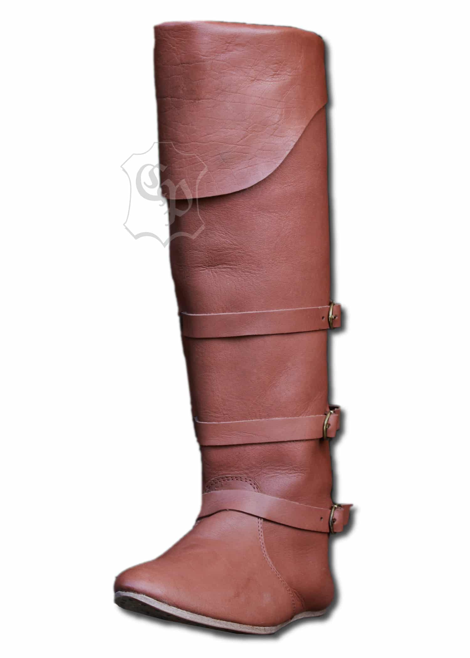 Bottes médiévales tardives élaborées selon un modèle de la fin du Moyen Âge en peau de vache robuste et épaisse. La jambière de 55 cm ( avec le rabat) monte jusqu’au-dessous du genou et a une manchette cousue, qui recouvre également la rotule. La fermeture à triple sangle assure un ajustement ferme, la semelle est fixée avec des clous pour une longue durabilité et stabilité.