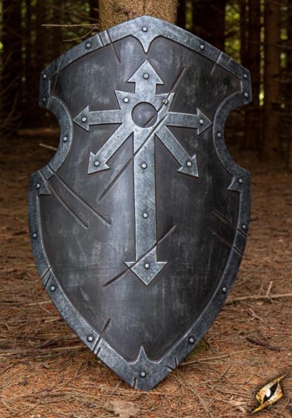 Fabriqué en mousse à cellules fermées et recouvert de latex, ce bouclier est plus que prêt pour le combat GN/LARP. Sculpté et peint à la main avec des détails réalistes comme des rayures et des encoches, ce bouclier est doté d’une finition métallique mate foncée et d’une garniture métallique avec des rivets. Une croix stylisée apparaît au centre. Maintenez votre prise sur ce bouclier Maraudeur grâce à la poignée à trois positions et aux sangles à boucles réglables qui se trouvent sur la face intérieure.