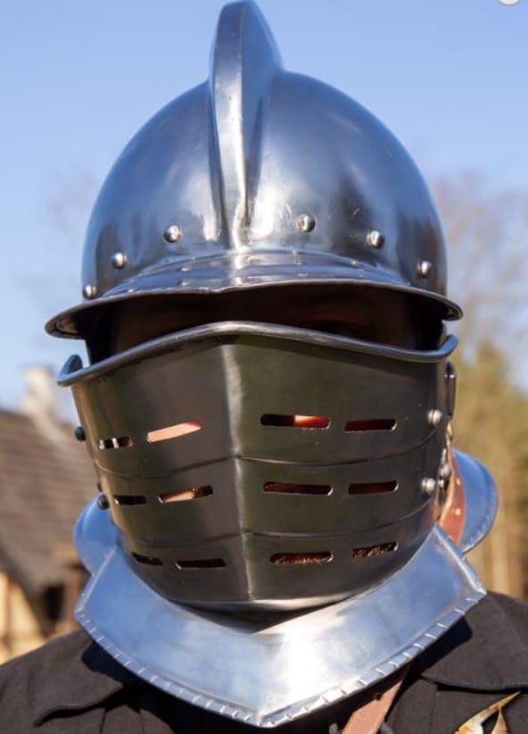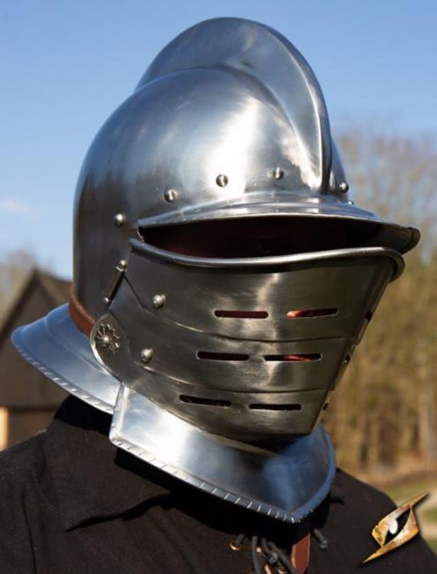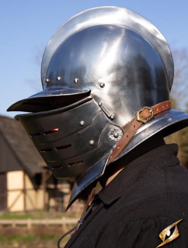 Le casque Bourguignotte en acier poli d’Epic Armoury est un casque de protection avec une visière inspirée du casque historique utilisé au XVIe siècle par les unités de cavalerie. La visière est renforcée et formée pour s’adapter confortablement autour du visage sans restriction de la vision, encadrant un visage protégé par des protège-joues allongés. Une crête longe le haut du casque de l’avant vers l’arrière, agissant comme un déflecteur contre les coups, tandis qu’une plaque de cou incurvée protège la nuque.