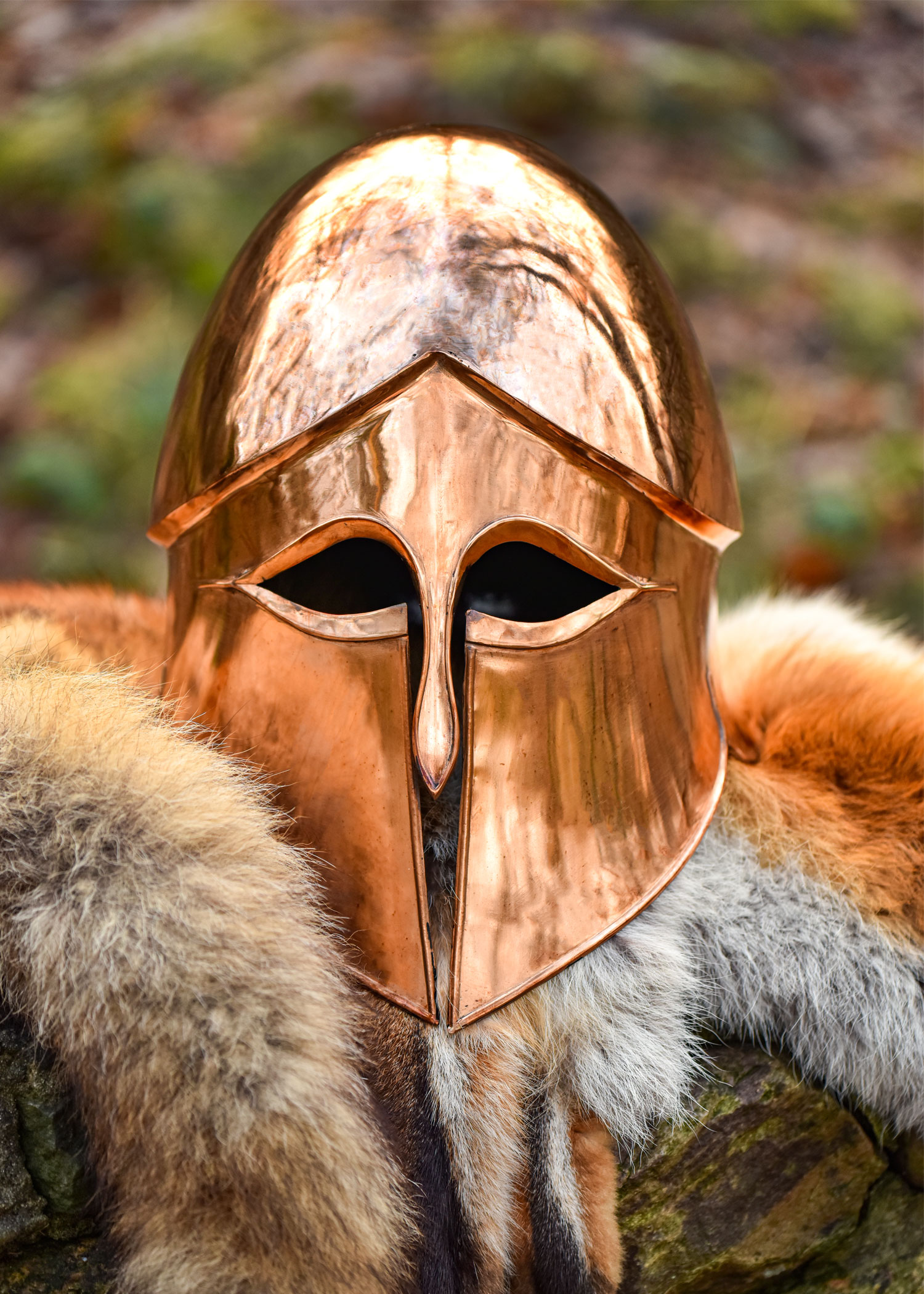 Notre réplique est basée sur le type corinthien «A». La coque est faite à la main en bronze massif. Il n’y a pas de doublure car les rivets auraient endommagé la calotte du casque. Mais nous ajouterons une cale rembourrée douce à chaque casque, une pièce parfaite pour les collectionneurs et les reconstituteurs de l’époque grecque antique, tels que les Hoplites.