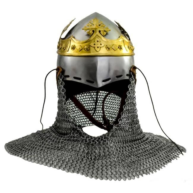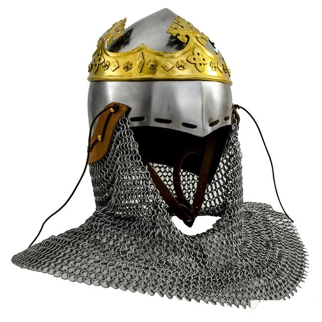 Notre casque Robert the Bruce est une réplique du bascinet porté par Robert Ier the Bruce sur sa célèbre statue sur le site du champ de bataille de Bannockburn. Il s’agit d’une réplique précise d’un casque de cette période et comporte un camail pour protéger le cou et est monté avec une couronne en laiton. Ce casque est fabriqué à la main en acier de calibre 18. Non recommandé pour le combat.