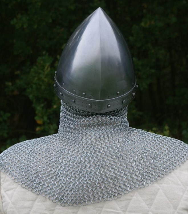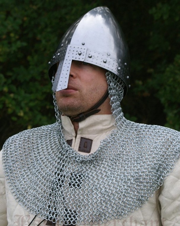 Casque viking typique à nasal avec un camail pour la protection du cou et des épaules. Fabriqué en acier finement travaillé et riveté. La livraison comprend un renfort en cuir réglable ainsi qu’une jugulaire.