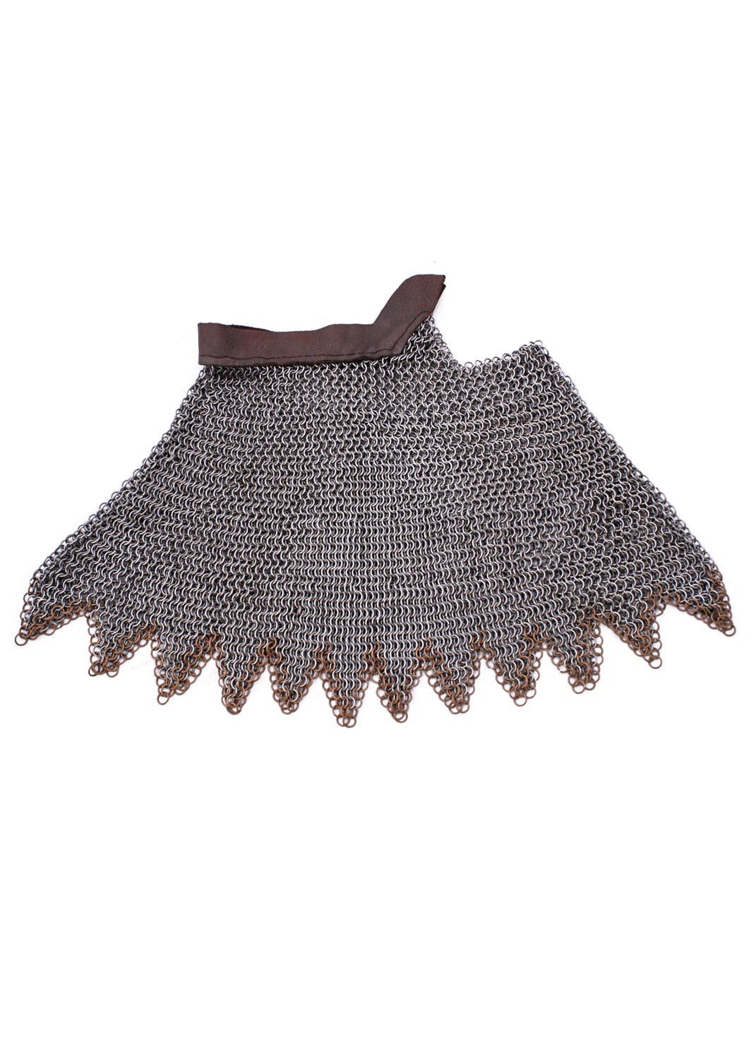 Ce colletin de mailles d’Ulfberth présente un bord dentelé authentique et une sangle en cuir de vachette épaisse cousue sur le dessus. Les trous de fixation doivent être percés dans le cuir par le client.