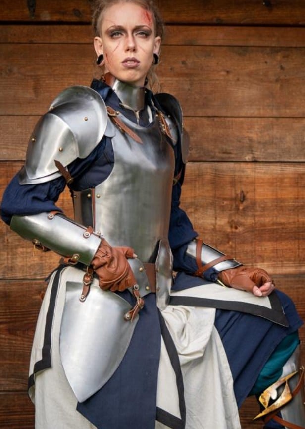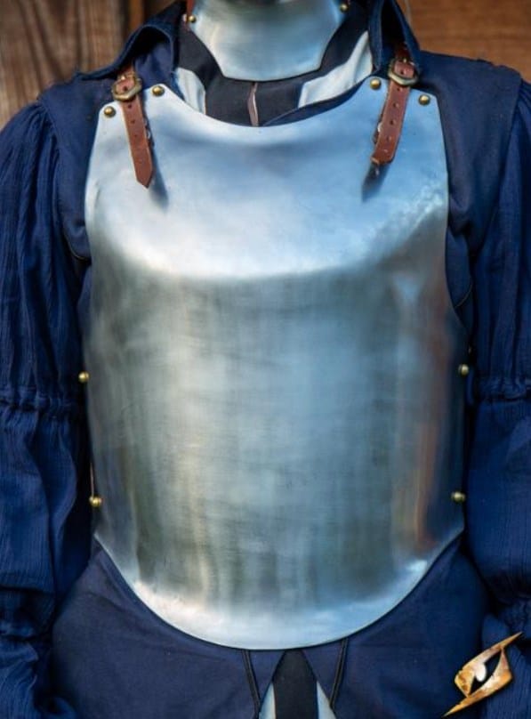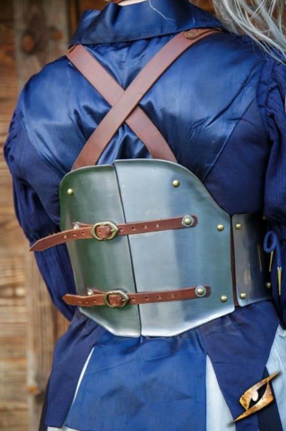 Cette cuirasse est une armure de torse conçue pour protéger le haut de la poitrine et la taille, ainsi que le bas du dos. Fabriquée à la main à partir d’acier doux de 1 mm d’épaisseur, cette armure de torse est dotée d’une plaque avant malléable qui offre une excellente protection et un excellent mouvement. La forme de la plaque avant est spécialement conçue pour être plus confortable pour une joueuse. Ces plaques sont fixées avec du cuir tanné végétal à deux plaques du bas du dos, qui peuvent être attachées ensemble pour que l’armure du torse soit une plaque avant et arrière combinée.