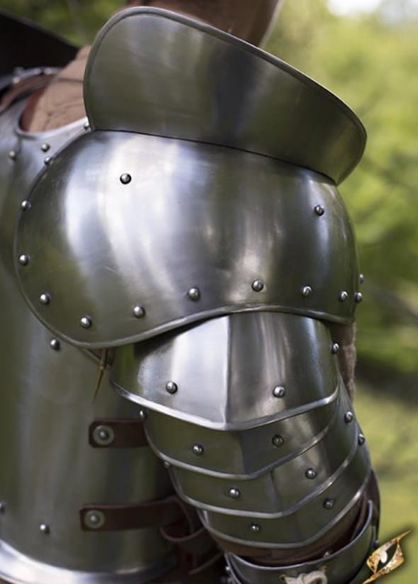 Les epaulières de Guerrier Géant de Epic Armoury est un ensemble de deux protège-épaules conçus pour protéger les articulations des épaules et le haut du bras. Les plaques métalliques de cette armure se chevauchent pour offrir une protection complète du stratifié. Les epaulières sont recouvertes d’une grande spallière qui offre une protection supplémentaire aux articulations et aux aisselles. Au sommet de l’épaulière, un brise-épée à plaque verticale bloque et dévie les coups avant qu’ils ne puissent toucher la tête. Le brise-épée est légèrement concave et un peu plus haut à l’arrière qu’à l’avant, offrant ainsi une protection sans nuire à la vision. Bien que l’armure soit conçue pour correspondre à l’ensemble «Guerrier» d’Epic Armoury, elle est entièrement interchangeable avec d’autres armures Epic Armoury afin de personnaliser entièrement le look de votre personnage.