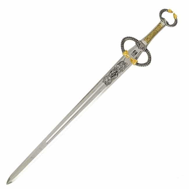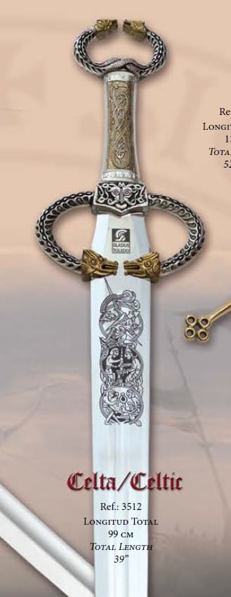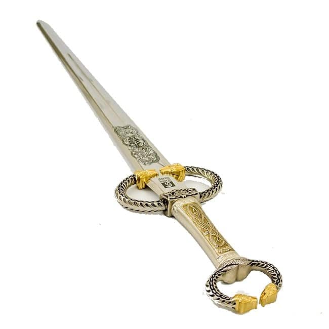 Notre épée d’antennes celtique de Art Gladius est inspirée des épées maniées par les Celtes de l’Est de Hallstatt et de l’Italie du Nord au début de l’âge du fer. La garde et le pommeau sont de style antenne, se terminant par des têtes de dragon dorées, et ressemblent aux couples portés par la noblesse celtique. La poignée en métal présente une bête celtique entrelacée, peut-être un serpent, et se termine par la représentation de l’homme vert au centre de la garde. La longue lame en acier inoxydable présente des gravures représentant un conte des premières sagas.