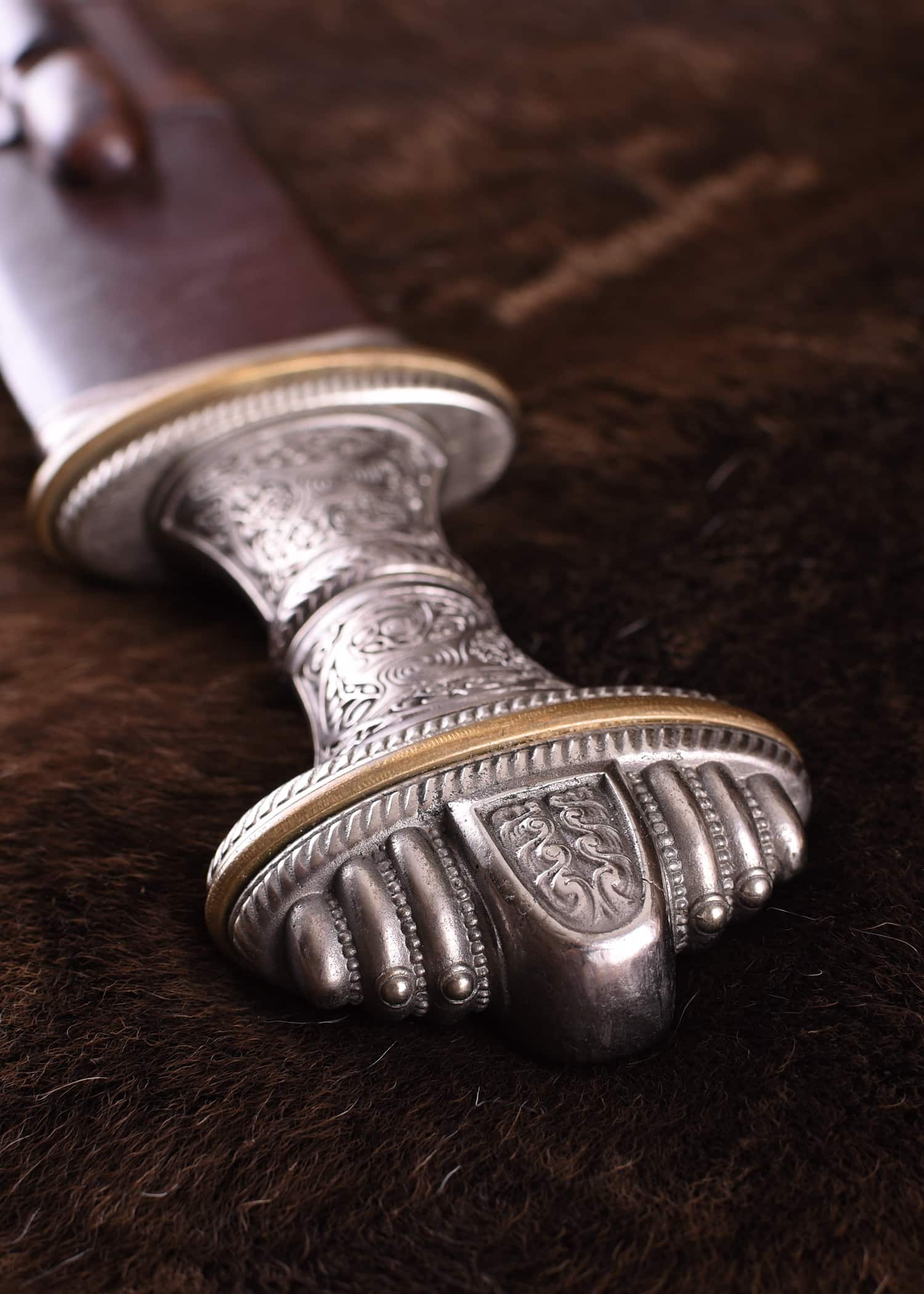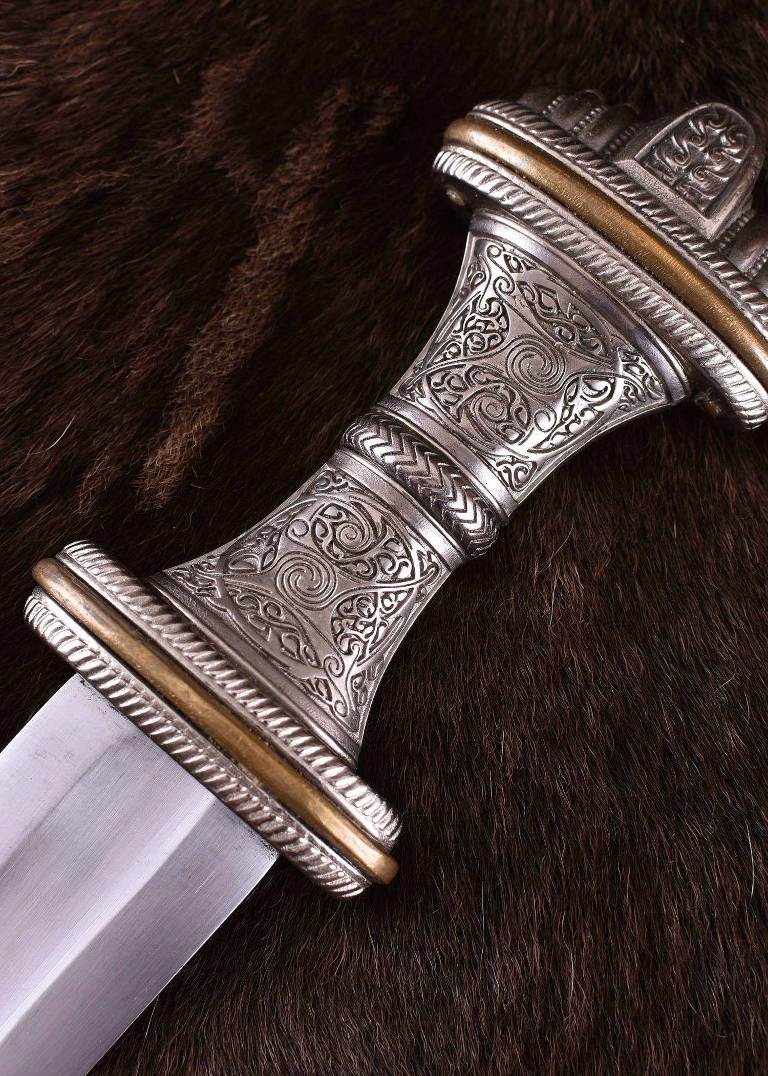 La poignée richement décorée est coulée en laiton et étamée pour lui donner une finition argentée. Il est composé de plusieurs parties rivetées ensemble (tout comme l’original) et recrée fidèlement les beaux dessins de la pièce de musée. Le capuchon de pommeau est constitué d’un élément central bombé flanqué de trois lobes plus petits et de motifs de fil perlé de chaque côté. Le pommeau et la garde ont tous deux la même disposition en trois parties et comportent des nervures diagonales et une couche de laiton intermédiaire sans revêtement d’étain. La poignée est densément et finement ornée de différents motifs de plantes / vrilles et d’animaux à feuilles entrelacées de chaque côté (serpents tourbillonnants d’un côté et créature ressemblant à un oiseau ou à un aigle de l’autre).