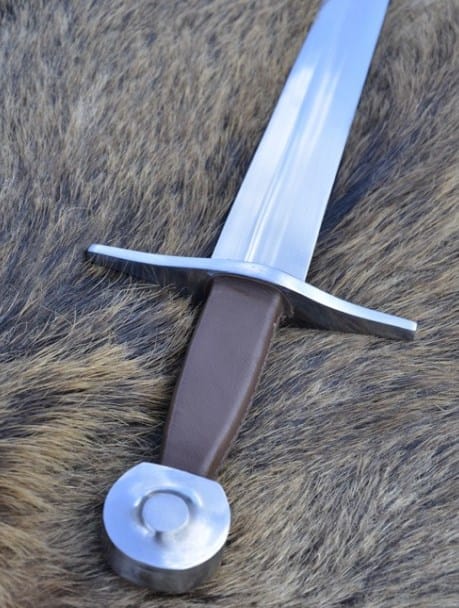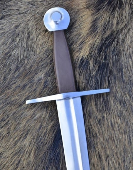 La lame en acier au carbone de haute qualité est forgée en une seule pièce au pommeau et rivetée.  La pointe est arrondie. La garde et le pommeau sont en acier.