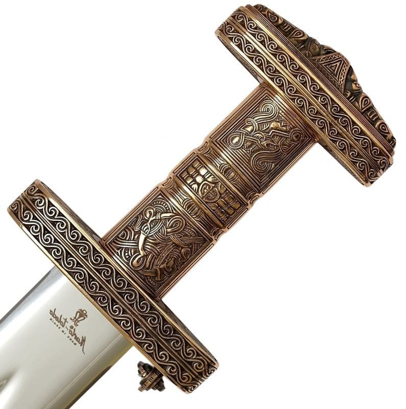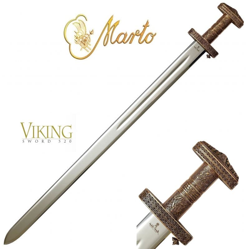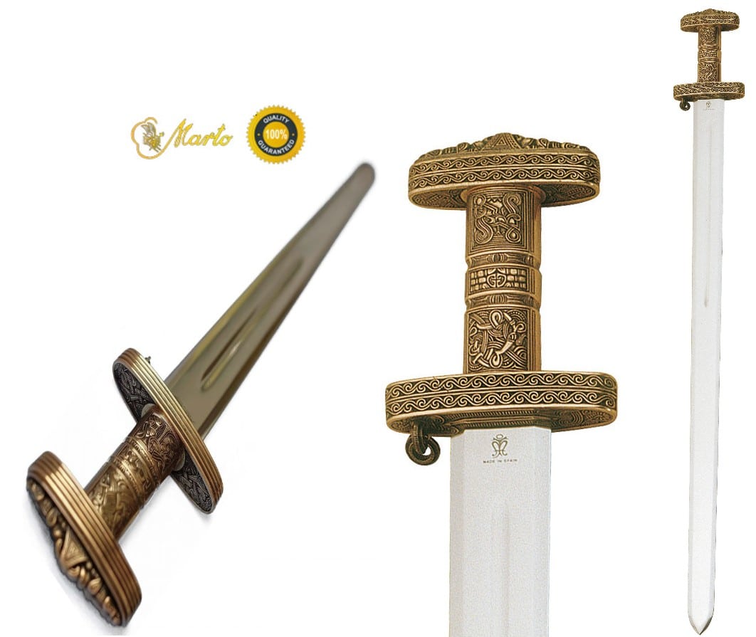 Notre épée Viking Oslo Marto a été fabriquée à la main par Marto à Toledo , en Espagne. C’est une reproduction d’une épée Viking du 9ème au 10ème siècle, caractérisée par une grande lame en acier avec une gouttière centrale le long de son tiers supérieur. L’épée Viking a une lame en acier inoxydable forgée et entièrement trempée qui a été polie et détaillée. Cette lame d’épée ne rouille pas et ne nécessite aucun soin. La poignée en métal coulé plaqué bronze est finement travaillée avec des figures géométriques et abstraites. La garde est courte et elliptique, la poignée est droite et le pommeau est spéculaire à la garde même s’il est de taille réduite. Avec plus de 47 ans d’expérience, vous pouvez être assuré que votre épée Marto est l’une des meilleures épées décoratives disponibles sur le marché aujourd’hui. Longueur totale 36 1/2 »