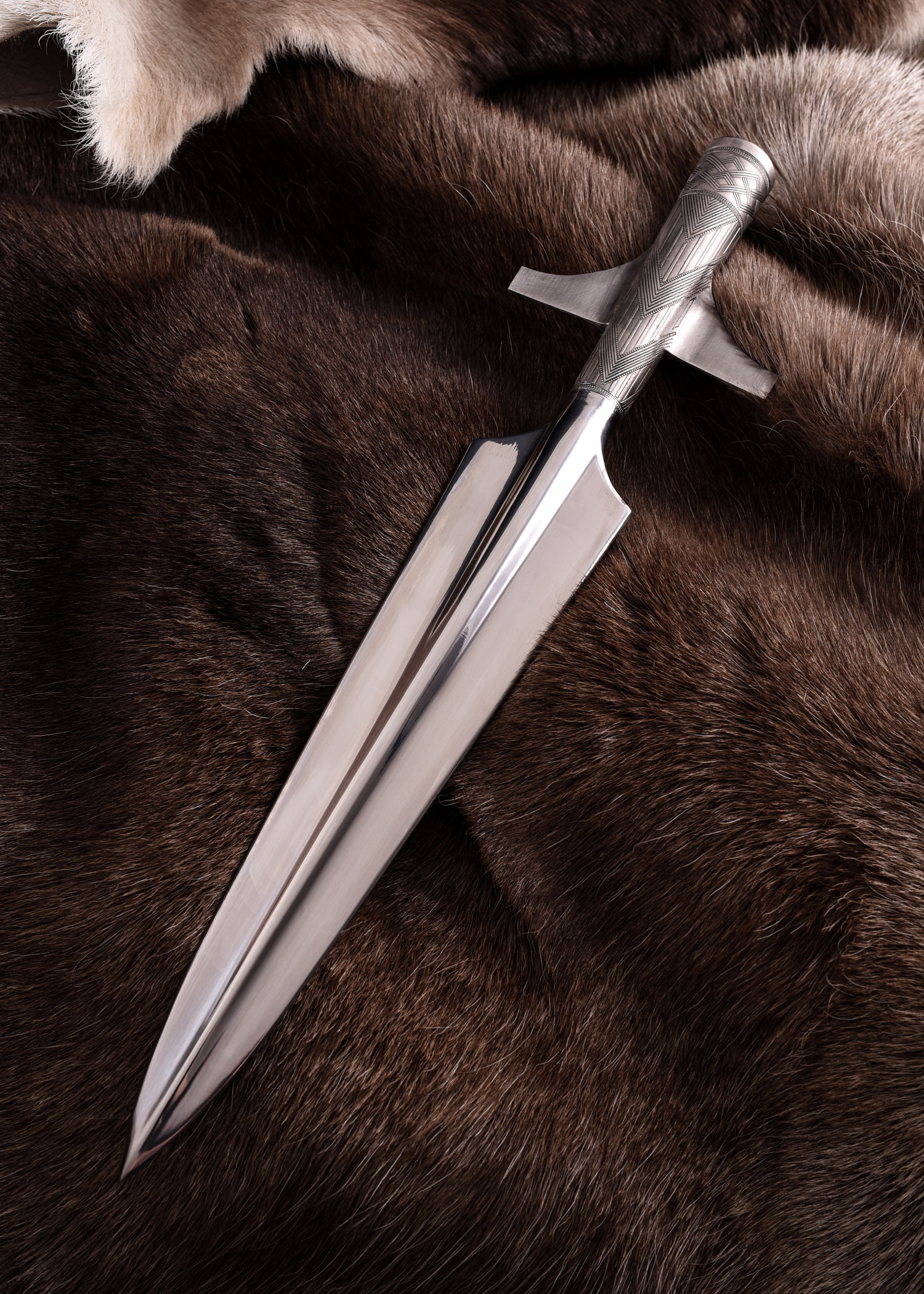 Les fers de lance décorés de Hanwei, conçus par Paul Chen, illustrent le mélange créatif d’art et de guerre des Vikings, où les armes portaient souvent des motifs complexes créés à l’aide du processus niello. Cela impliquait l’utilisation d’un alliage de plusieurs métaux (notamment l’argent) mélangé à du soufre, qui était frotté en un motif incisé puis cuit.