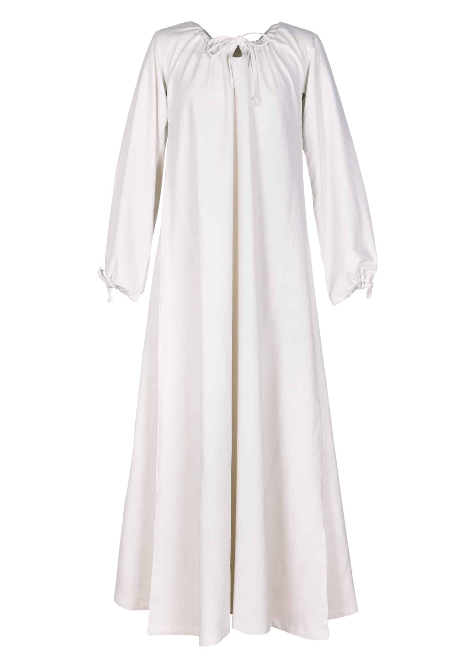 La robe est faite de tissu de coton uni et peut être portée soit comme une chemise, soit comme un vêtement d’extérieur. Les modèles blancs et de couleur naturelle sont légèrement transparents contre la lumière.