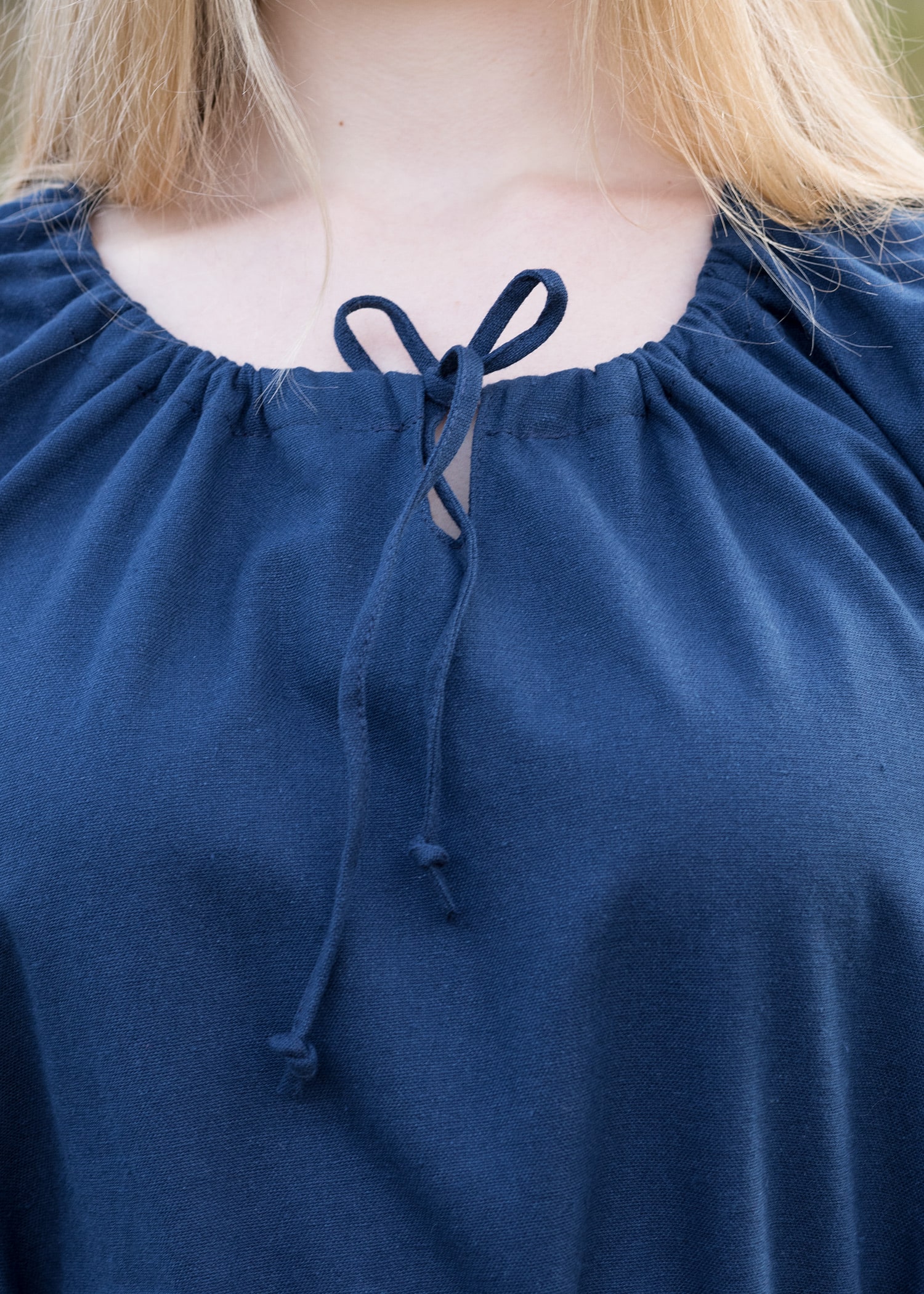 Le décolleté froncé est basé sur un fragment de textile archéologique trouvé à Pskov, en Russie, et aurait appartenu à une robe viking du Xe siècle. Il a une fente sur le devant et peut se fermer avec des liens. Les poignets sont également équipés de liens pour créer des manches froncées.