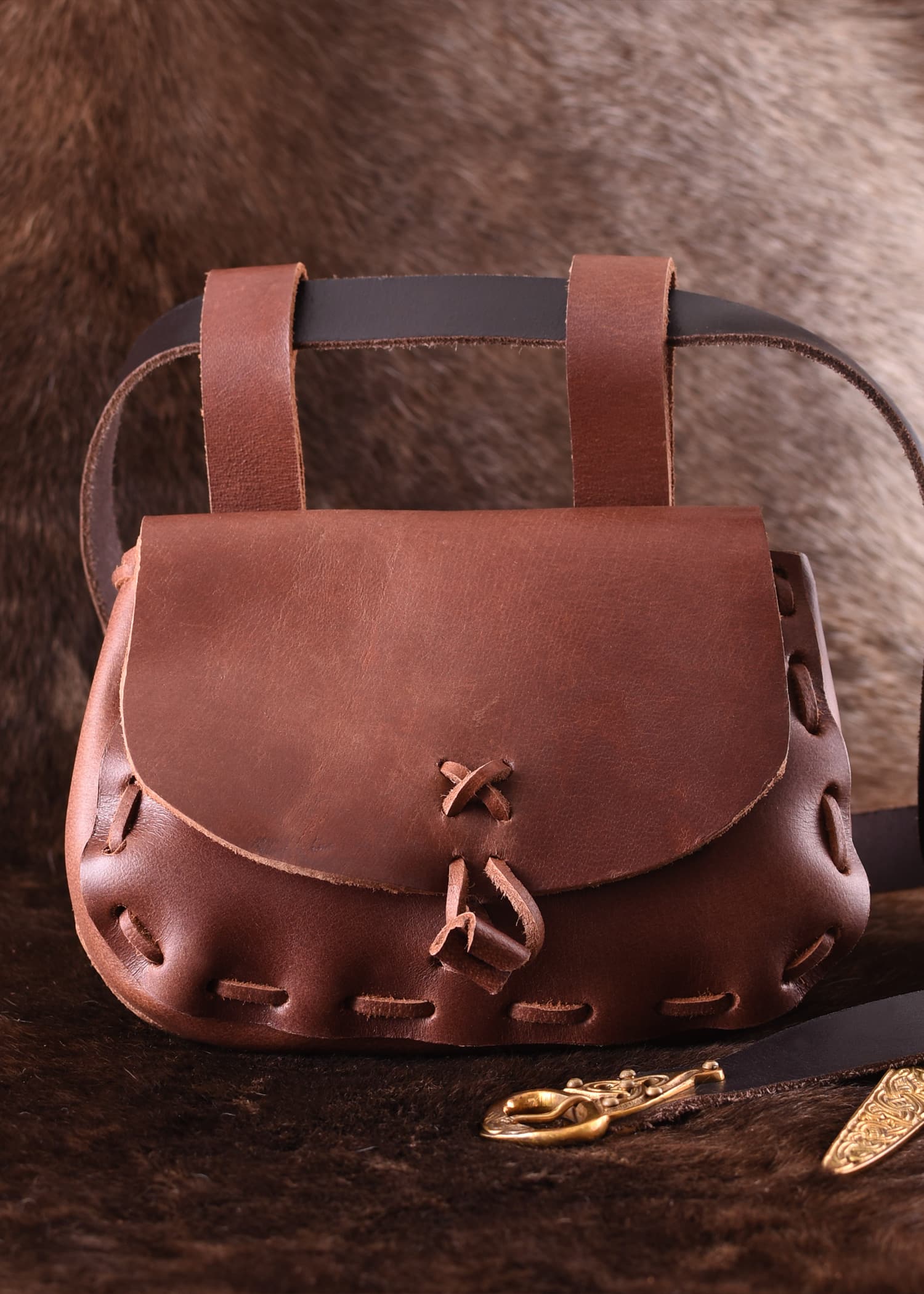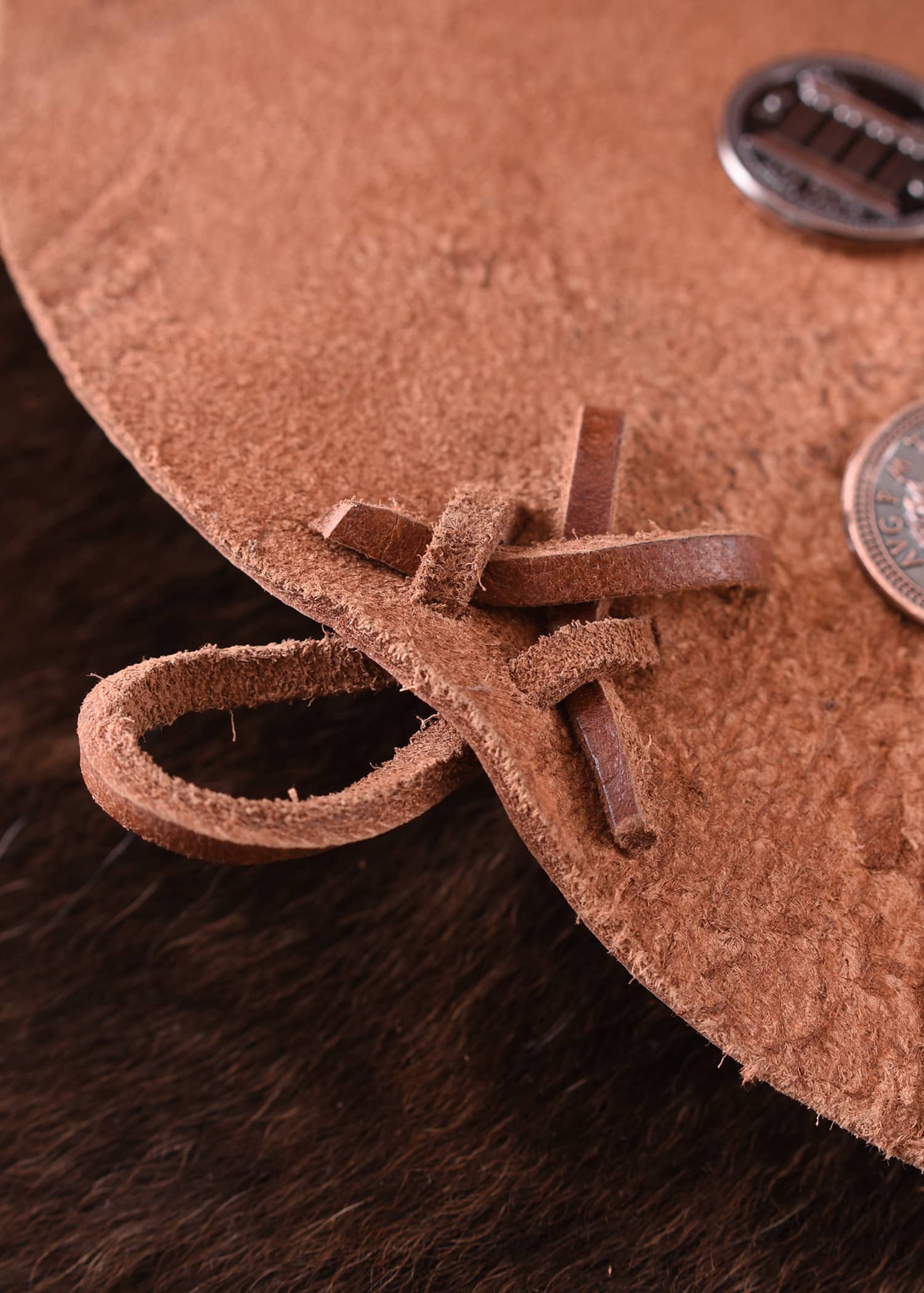 avec un nœud en cuir roulé. Il n’est pas vissé, mais les pièces sont lacées et nouées avec des lanières de cuir. Cette sacoche est réversible.