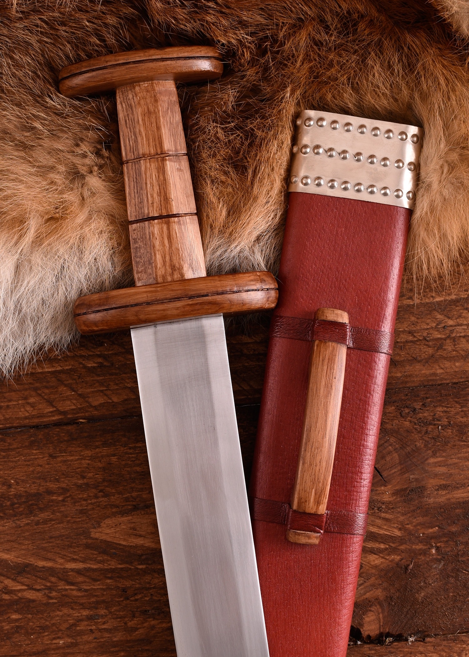 Le fourreau en bois est enveloppé de cuir rouge. La chape et le médaillon sont en métal. Il comporte également une boucle de ceinture en bois pour un transport facile.